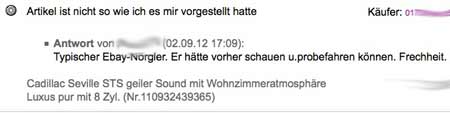 Ganz beliebt ist es inzwischen offenbar geworden, den Artikel als „entspricht nicht ganz der Artikelbeschreibung“ bzw. „Artikel ist anders als erwartet“ zu melden und dann in eine Nachverhandlung einzutreten. Da fehle dann der Y-Stöpsel oder die tibetanische Anleitung oder es sei ein winziges Haar mit in der Packung gewesen oder -wie auch immer- der Karton habe nach Kuhscheiße, Pappe oder Stadtluft gerochen. Kein Argument ist da zu blöde, um nicht nachträglich noch 10 oder 20% Preisnachlass heraus zu schinden.